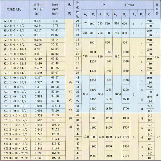 SZL(B)型翅片管散熱器,用無縫鋼管φ25×2.5mm作為基管,鋁孔翅片管外徑為直徑57mm,根徑為φ26.5mm,片距為2.8mm組成。散熱性能好、使用可靠、耐腐蝕性、光潔、美觀。廣泛應用于乳品、啤灑、食品、淀粉、化工、造紙、機械、醫藥、空調、印染等行業。